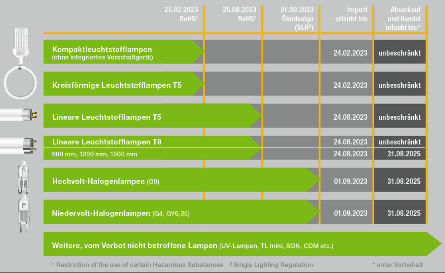 Ab 2023 werden daher keine Leuchtstofflampen mehr in den Verkehr gebracht. Ware, die bereits im Handel ist, darf verkauft und erworbene Lampen dürfen weiterverwendet werden. Da Lagerbestände endlich sind und die vollumfängliche Funktionalität von Beleuchtungsanlagen auch in Zukunft garantiert sein muss, ist frühzeitige Planung essenziell.